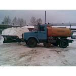 В зимнее время года на поливомоечную машину устанавливается отвал, который предназначендля уборки снега на городских дорогах. Цистерна демонтируется и на ее место устанавливается бункер объемом 5 м3 для песчано-солевой смеси, при помощи это бункера машина может разбрасывать песчаную смесь с реагента... подробнее